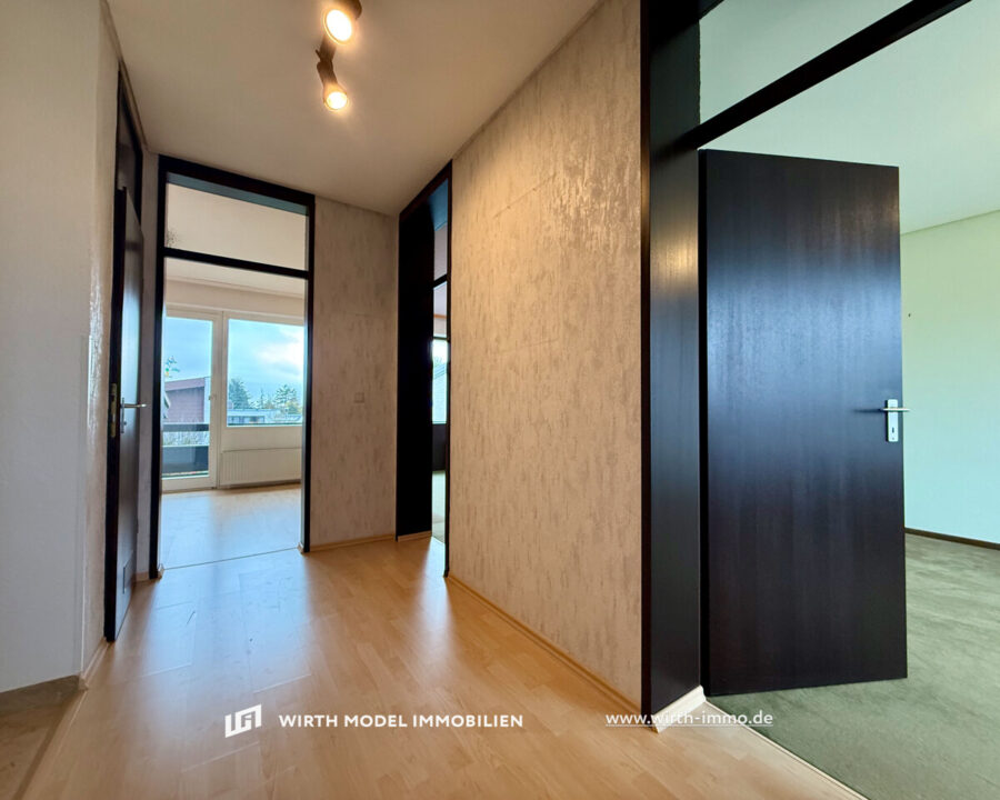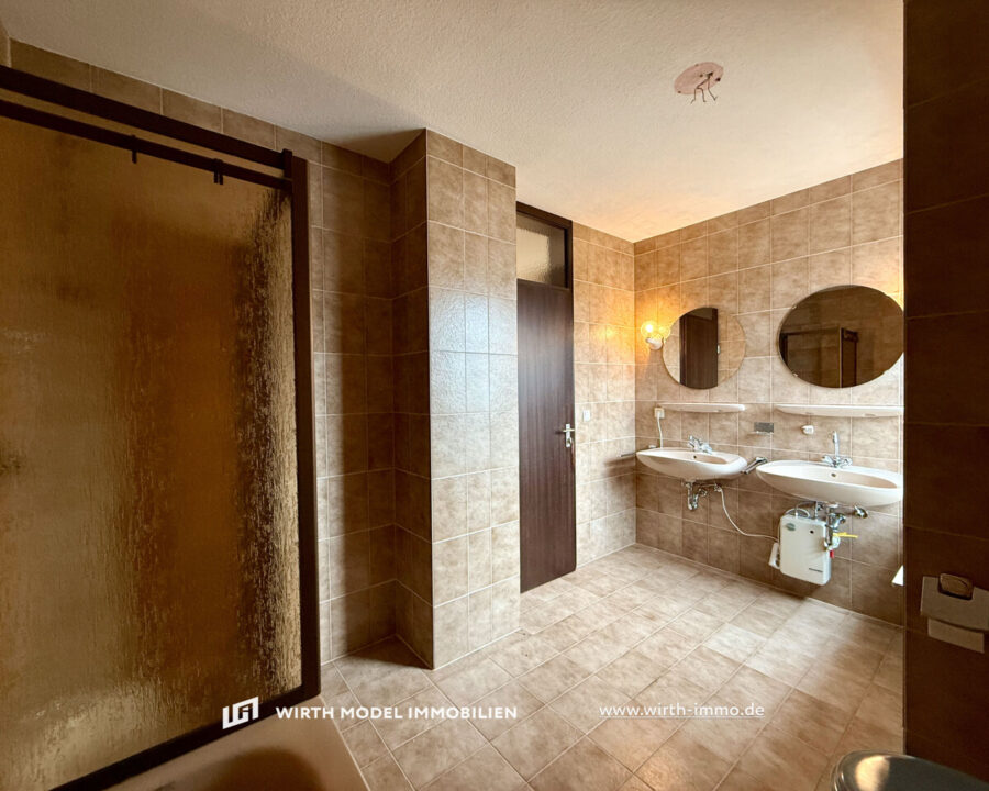 Das sonstige Hausanwesen ist bezüglich des Grundrisses durch versetzte Ebenen angelegt worden. So wird die Obergeschossebene durch eine Diele erschlossen, welche den Zugang in die beiden Kinderzimmer (eines mit Balkon-Zugang) sowie in das Schlafzimmer mit Balkon-Zugang ermöglicht. Abgerundet wird diese Geschossebene durch die sanitären Anlagen in Form eines innenliegenden Gäste-WCs sowie durch ein Tageslicht-Badezimmer mit Doppelwaschbecken, WC, Dusche und Badewanne.