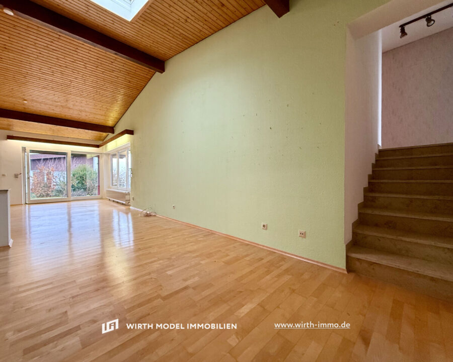 Zum Verkauf steht dieses attraktive Einfamilienhaus in gefragter Lage Dittelbrunns. Betreten wir dieses über eine große Diele, welche gelungen in den offen angelegten Wohn-/Essbereich des Erdgeschosses überleitet. Dieser ist durch ein Oberlicht, sowie durch große Fensterflächen schön belichtet und mit einer Fläche von rd. 46 m² großzügig angelegt. Eine Austrittsmöglichkeit auf die Gartenterrasse und in den Garten ist gegeben. Die Wohnküche ist unmittelbar neben dem Wohn-/Essbereich gelegen.
