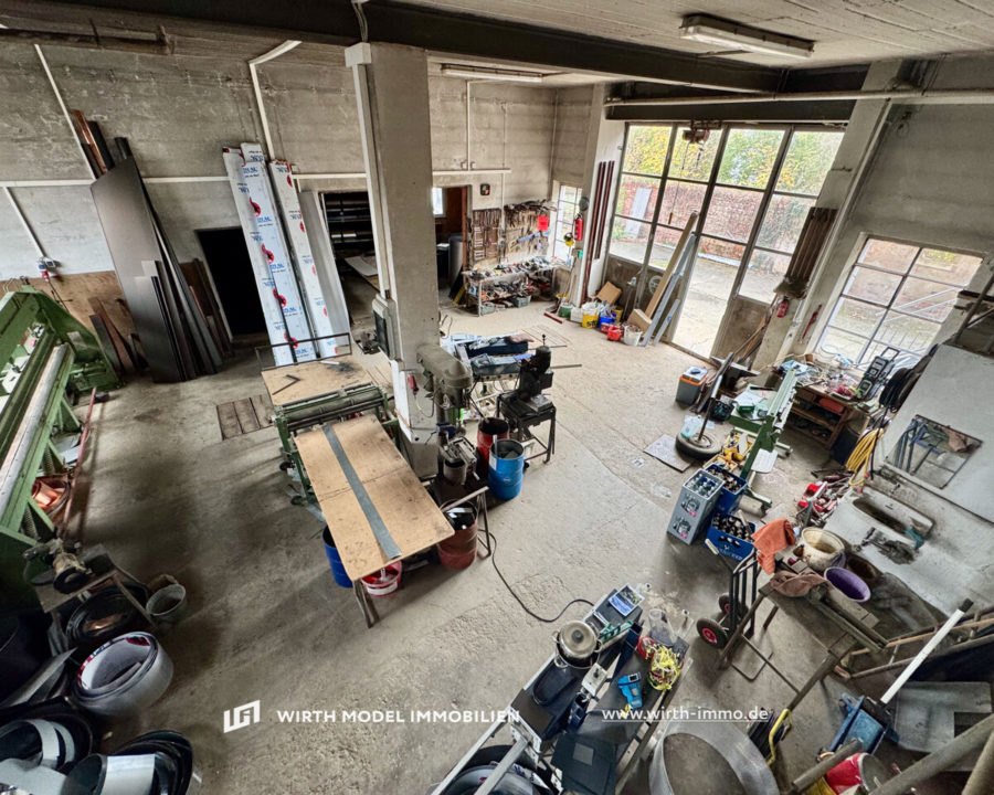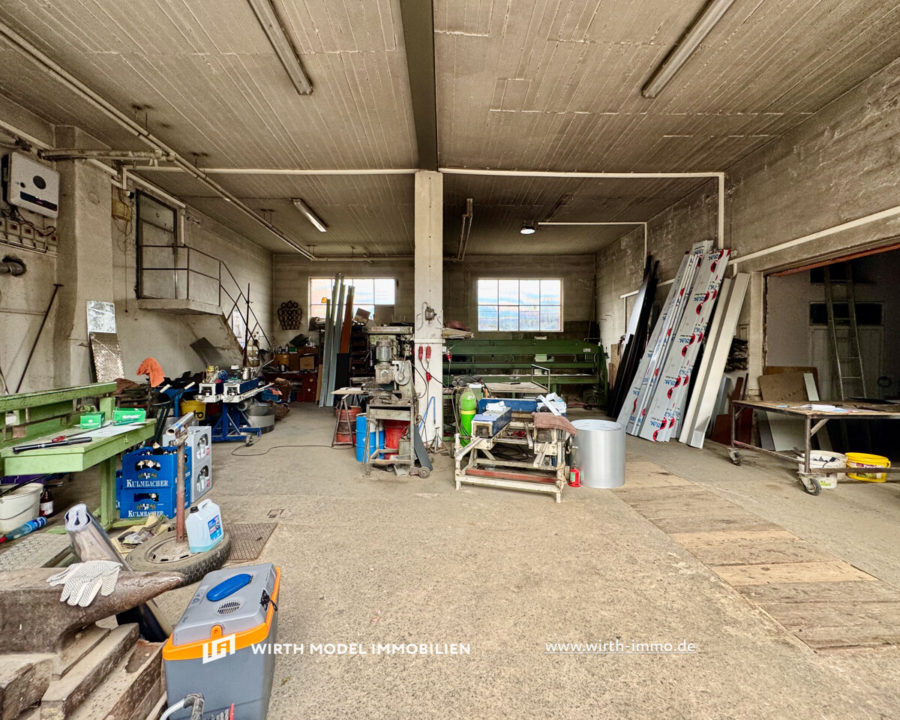 - Werkstatthalle (rd. 9 m x rd. 11 m) mit zwei Einfahrtstoren