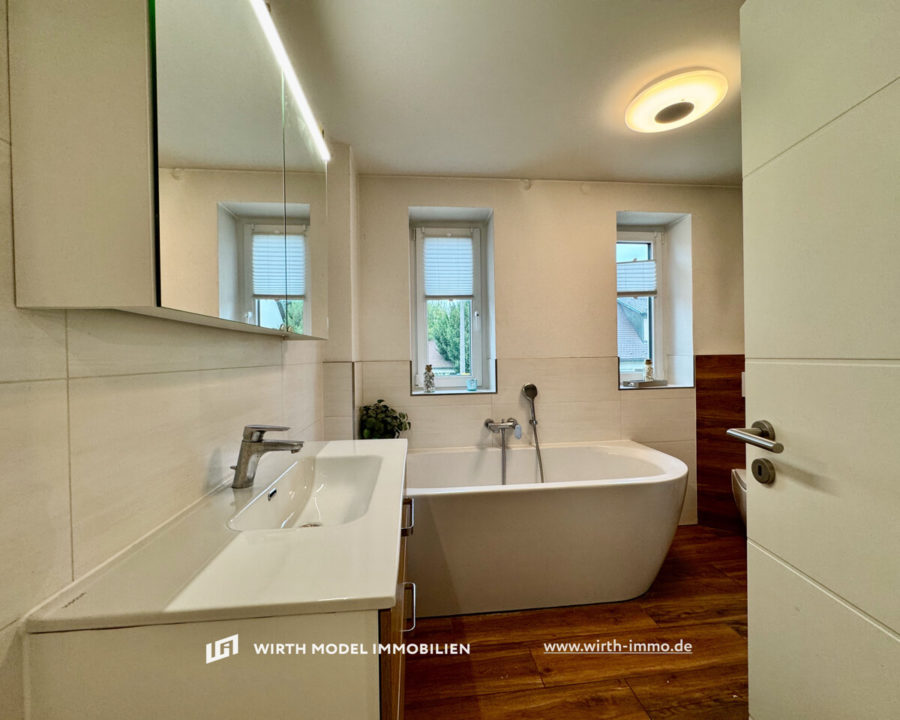 Zum Verkauf steht diese sanierte Doppelhaushälfte in gefragter Wohnlage Schweinfurts. Betreten wird diese durch das Treppenhaus, welches gelungen in den Flur des Erdgeschoss es überleitet. Die Erdgeschosswohnebene beinhaltet einen sehr geräumigen und offen gestalteten Wohn-/Ess-/Küchenbereich mit Austrittsmöglichkeit in den rückwärtigen Garten. Die Einbauküche mit den zugehörigen Elektrogroßgeräten (außer Kühl-/Gefrierschrank) und eine Kochinsel ist im Kaufpreis enthalten und wird entsprechend mitverkauft. Abgerundet wird das Erdgeschoss durch ein geräumiges Schlafzimmer (ebenfalls mit Garten-Zugang) sowie durch ein ansprechendes Tageslicht-Badezimmer mit bodengleicher Dusche, Wanne, WC und Handwaschbecken. Die Badezimmer Möbel sind ebenfalls im Kaufpreis enthalten und werden mitverkauft.