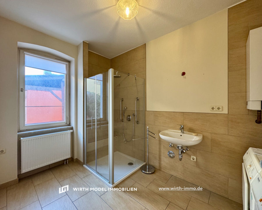 Im zweiten Obergeschoss befindet sich die dritte Wohneinheit des Vorderhauses. Diese umfasst rund 59 m² Wohnfläche und verteilt sich auf drei Zimmer: zwei Schlafräume sowie ein großzügiges Wohn-/Esszimmer mit angrenzender Küche. Das WC ist vom Badezimmer mit Dusche getrennt angeordnet.