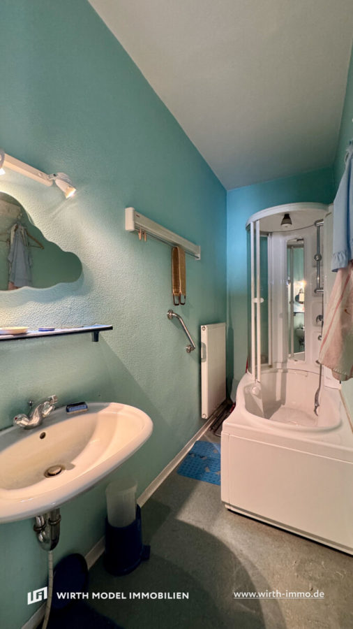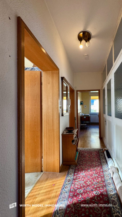 Die Erdgeschosswohnung verfügt über eine Wohnfläche von rund 61 m² und umfasst drei Zimmer. Über einen zentralen Flur gelangt man in die geräumige Wohnküche mit Einbauküche, das Wohnzimmer sowie das Schlafzimmer. Das Tageslichtbad mit Dusche, Waschbecken und Anschlussmöglichkeit für eine Waschmaschine wurde 2009/2010 saniert und liegt unmittelbar neben dem separaten WC mit Handwaschbecken.