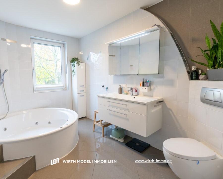 Das Obergeschoss der Immobilie wurde großzügig angelegt und wird durch eine schöne Diele erschlossen. Die sehr geräumige Wohnküche mit rd. 34 m² beinhaltet eine Einbauküche samt der zugehörigen Elektrogeräte und bietet ausreichend Raum für die Platzierung einer großen Essgruppe. Große Fensterflächen sorgen auch hier für erstklassige Belichtung. Eine angrenzende Abstellkammer kann auch als Speisekammer verwendet werden. Die sonstige Geschossebene wird durch ein großes Tageslicht-Badezimmer mit WC, Handwaschbecken und Whirlpool-Badewanne, sowie durch ein Schlafzimmer mit angrenzender Ankleide komplettiert.