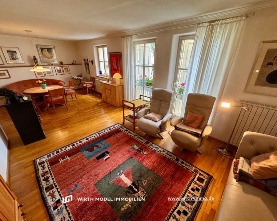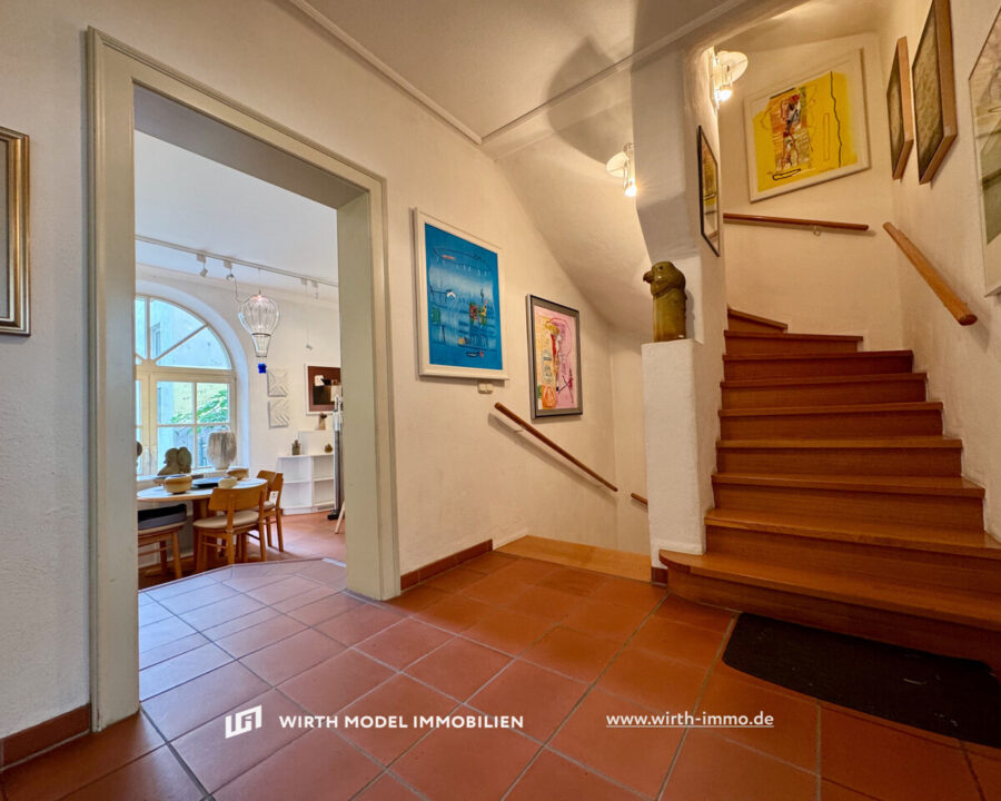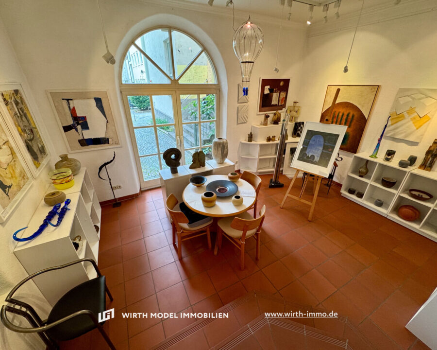 Zum Verkauf steht dieses einzigartige Einfamilienstadthaus mit einer sehr ansprechenden und lichtdurchfluteten Fläche im Erdgeschoss. Betreten wird die Immobilie durch einen charmant gestalteten Torbogen über die Erdgeschoss-Diele. Diese ermöglicht den Zugang in zwei Räume, welche derzeit als Atelier und Galerie genutzt werden, aber auch wohnwirtschaftlich nutzbar wären. Diese Räumlichkeiten sind durch die Treppenanlage separiert und durch Sprossenfensterflächen erstklassig belichtet. Ein traumhafter Ausblick auf die historische Schweinfurter Altstadt ist gegeben.