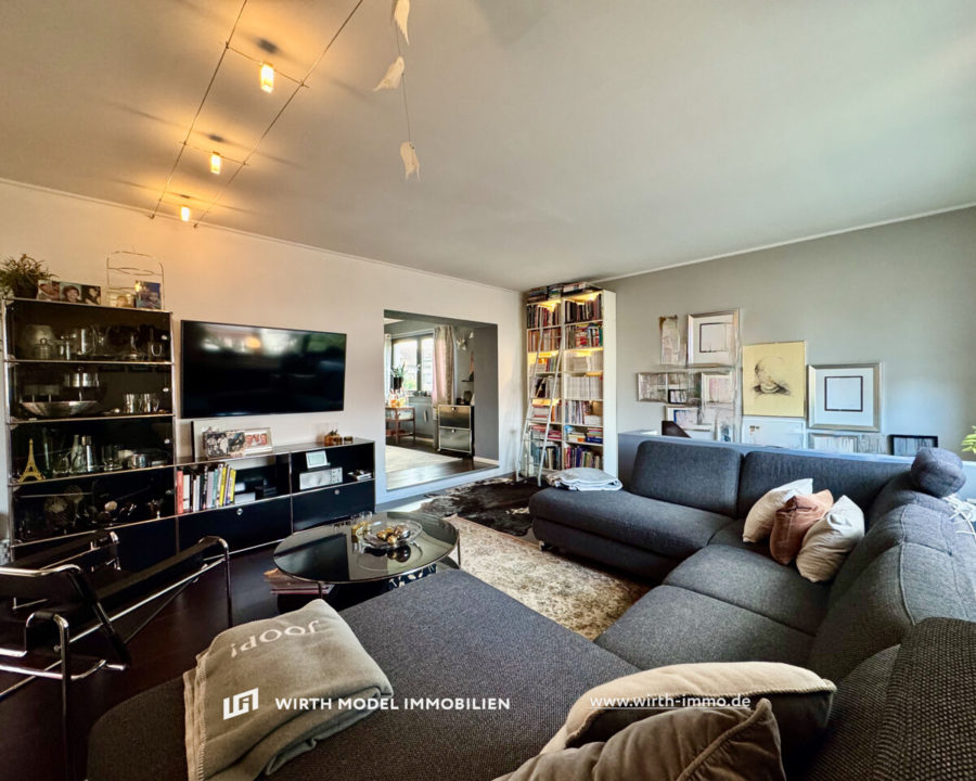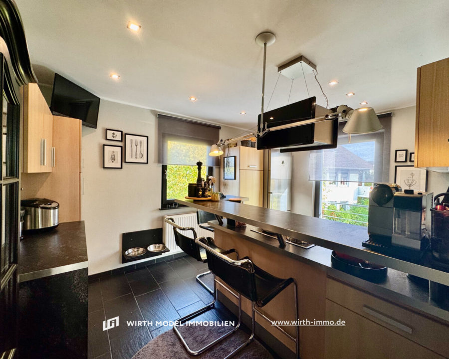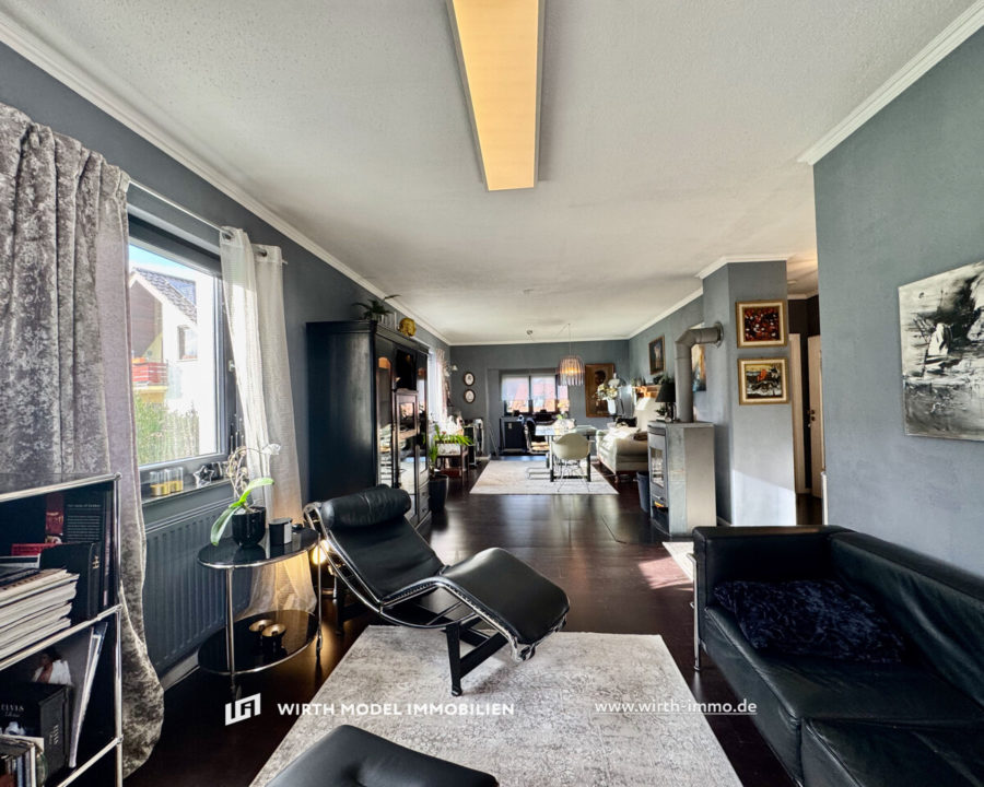 Die Obergeschosswohnung wird über das Treppenhaus erreicht und präsentiert sich als Maisonette-Wohnung mit ca. 122 m² Wohnfläche. Der offen gestaltete Flur führt in die separate Küche mit moderner Einbauküche, welche im Kaufpreis enthalten ist.