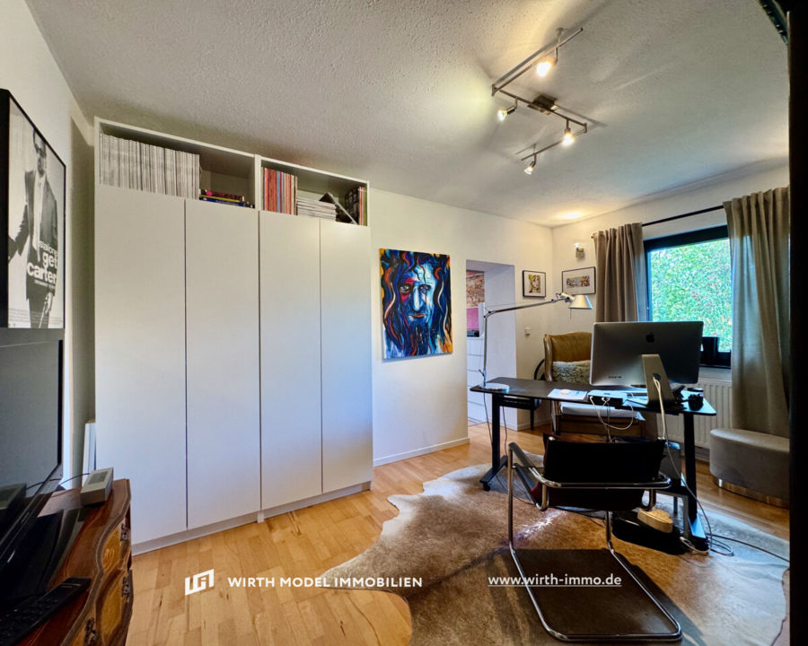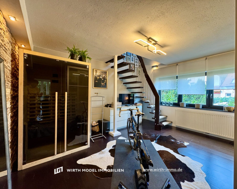 Ein Arbeitszimmer sowie ein Durchgangszimmer, welches sich ideal als Kinderzimmer eignet, ergänzen diese Wohnebene. Über eine innenliegende Treppe gelangt man in die Erdgeschossebene wo sich ein Fitnessraum befindet, der ebenfalls Zugang zum überdachten Freisitz bietet.