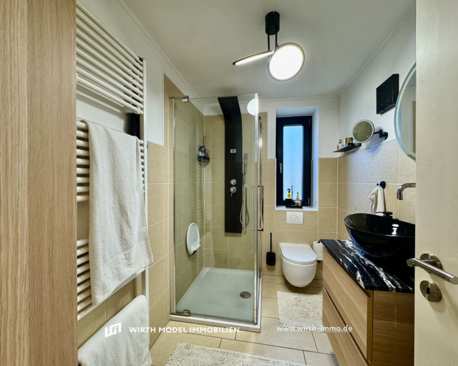 Das rund 30 m² große Wohnzimmer (derzeit als Schlafzimmer genutzt) besticht durch seine Helligkeit und den Zugang zu einer zweiten, überdachten Terrasse sowie zu einem praktischen Abstellraum. Zudem verfügt die Wohnung über ein Tageslichtbadezimmer, ausgestattet mit Dusche, WC und Handwaschbecken.