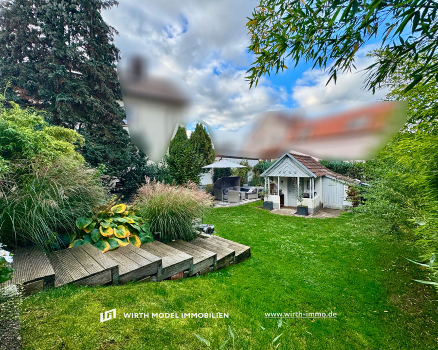 Die Außenanlagen überzeugen durch einen charmanten Vorgarten mit Pkw-Stellplätzen, zwei Terrassenbereichen und eine großzügige Gartenfläche mit Rasen- und Grünzonen. Ein massiv errichteter Gartenschuppen mit Satteldach rundet das attraktive Gesamtbild dieser Immobilie ab.