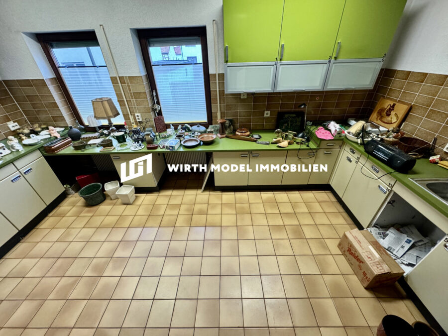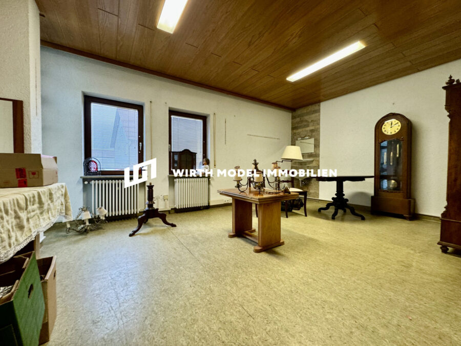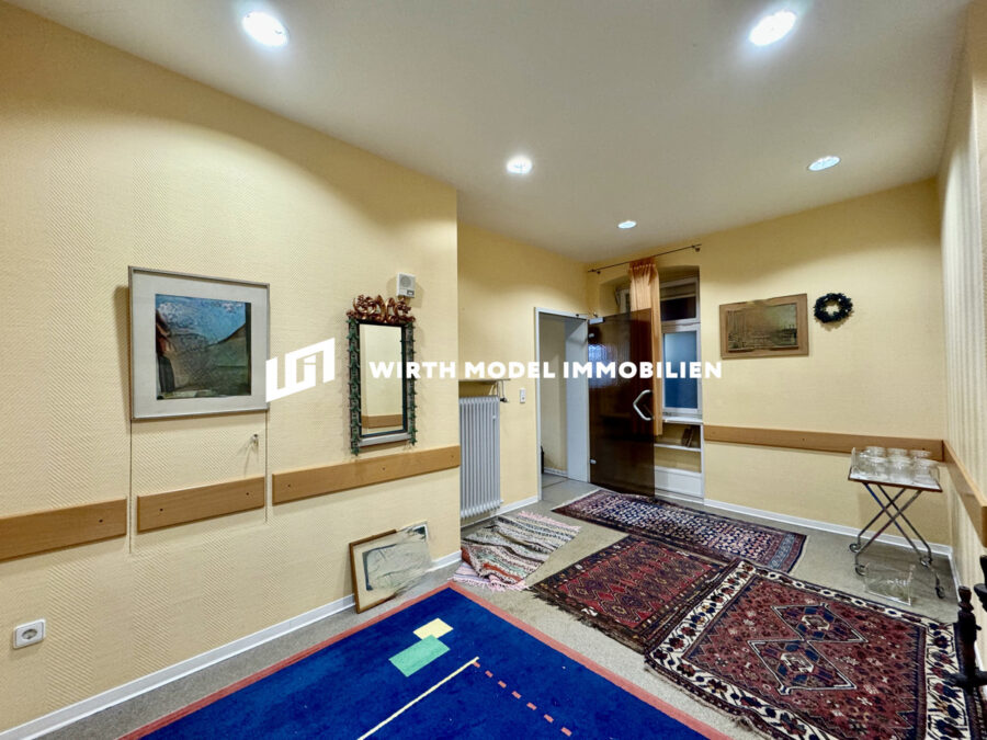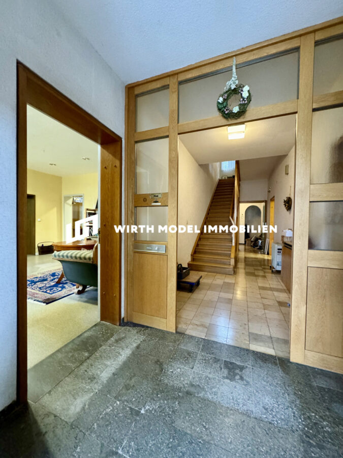 Zum Verkauf steht dieses 1904 erbaute Objekt mit zugehörigem Praxis-Anbau aus dem Jahre 1977 inkl. Unterkellerung samt Schwimmhalle sowie zwei Garagen und einem Nebengebäude. Betreten wird das Haupthaus durch einen Windfang, welcher einerseits den Zugang zum angrenzenden Praxisgebäude ermöglicht und andererseits in das Treppenhaus des Haupthauses überleitet. Dieser Treppenhaus- bzw. Flurbereich erschließt das Erdgeschoss des Haupthauses und ermöglicht den Zugang in das sehr geräumige Wohnzimmer mit angrenzender Küche sowie Arbeitszimmer. Zahlreiche Fensterflächen sorgen für eine schöne Belichtung. Abgerundet wird das Erdgeschoss durch einen rückwärtigen Dielenbereich mit Zugang zu einem WC und in einen Hauswirtschaftsbereich mit einem weiteren Badezimmer und einem Lagerraum. Die Fläche des Erdgeschosses Haupthaus beträgt 90 m². Der rückwärtige Grundstücksbereich kann durch die o. g. Diele betreten werden.