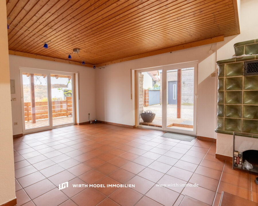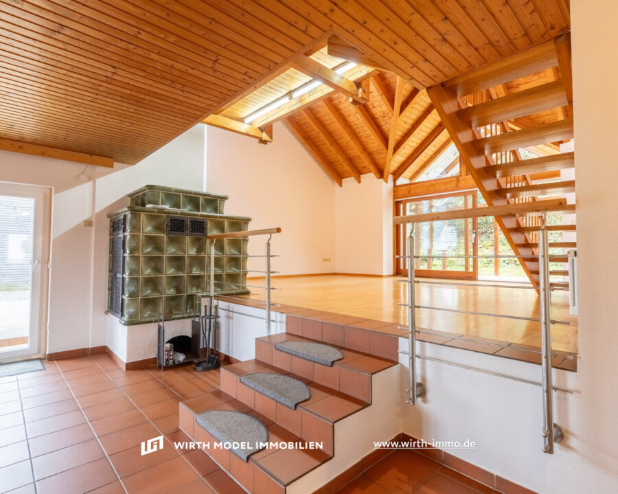 Betreten wird diese Immobilie durch die Diele der Hauptwohnung (mit rd. 154 m ) im Erdgeschoss. Ein Tageslicht-Gäste-WC ist im Eingangsbereich vorzufinden. Der Wohn-/Essbereich ist offen angelegt und ein Kachelofen sorgt für eine schöne und gemütliche Raumatmosphäre.