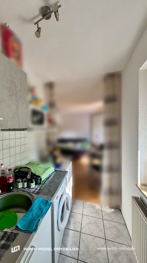 - Raumaufteilung: Flur, Badezimmer, offener Wohn-/Küchenbereich mit Balkon-Zugang