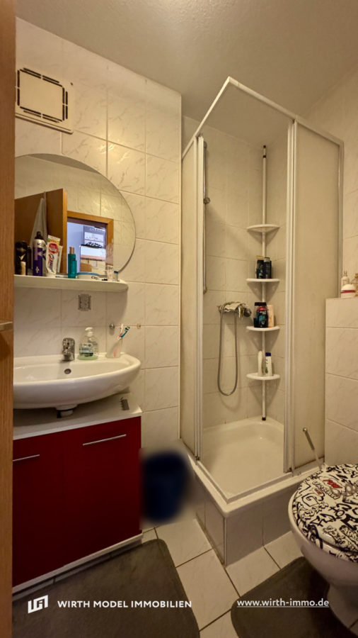 - Badezimmer innenliegend mit Dusche, WC und Handwaschbecken | Waschmaschinenanschluss in der Küche vorhanden