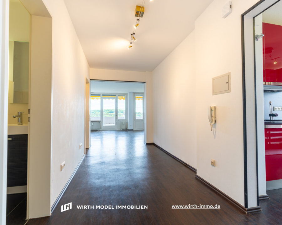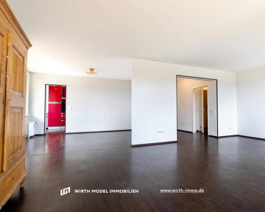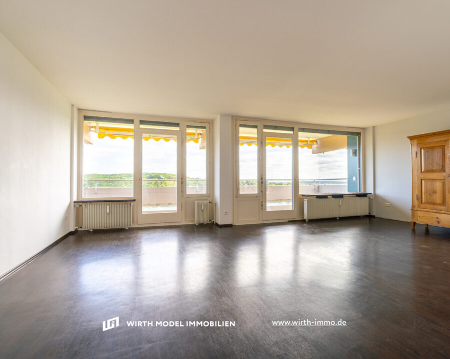 Zum Verkauf steht diese rd. 144 m² große Drei-Zimmer-Wohnung mit Tiefgaragen-Stellplatz in gefragter Lage am Schweinfurter Hochfeld. Im achten Obergeschoss gelegen (Aufzug vorhanden) wird diese über eine großzügige Diele betreten. Unmittelbar an der Diele ist einerseits das innenliegende Gäste-WC sowie die gegenüberliegende Küche mit Zugang zum Süd-Balkon gelegen. Die Einbauküche mit den zugehörigen Elektrogroßgeräten ist im Kaufpreis enthalten und verbleibt in der Wohnung. Durch die Küche kann das rd. 50 m² große Wohn-/Esszimmer mit Zugang zu beiden Balkonen betreten werden. Dieses ist durch bodengleiche und großflächig angelegte Fenster erstklassig belichtet und bietet dem Bewohner einen traumhaften Fernblick in die Natur.