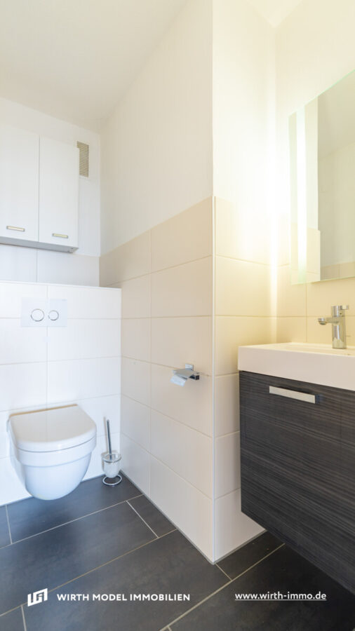 Die Weiteren Zimmer der Wohnung sind durch einen Flurbereich separiert. So befinden sich in diesem Wohnungsbereich das Schlaf- sowie Gästezimmer (beide mit Balkon Zugang) und das Dusch-Badezimmer mit Anschlussmöglichkeit für Waschmaschine und Trockner. Abgerundet wird die Wohnung durch eine praktische Abstellkammer sowie durch ein Badezimmer mit WC, Handwaschbecken und bodengleicher Dusche. Alle sanitären Anlagen befinden sich in einem neuwertigen Zustand. Die Waschtischunterschränke sind im Kaufpreis enthalten.