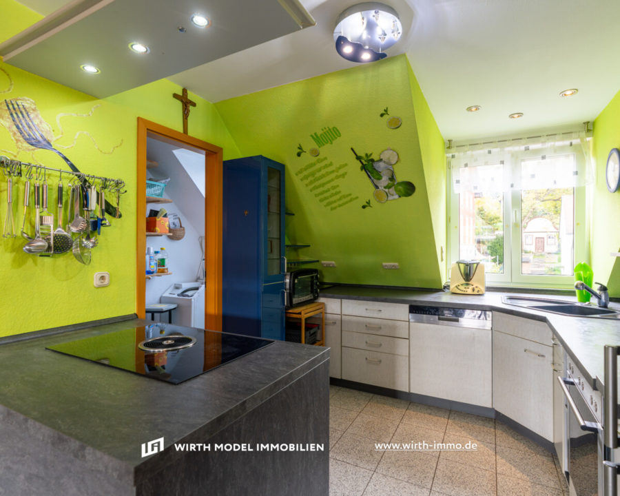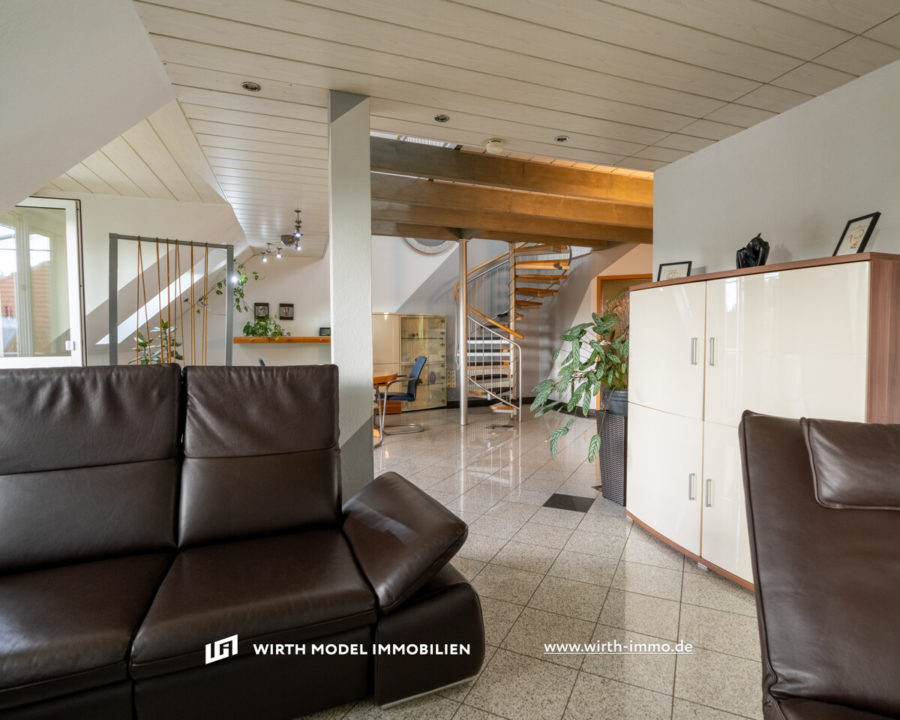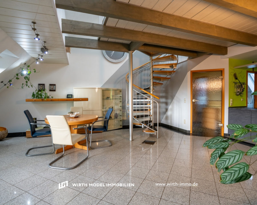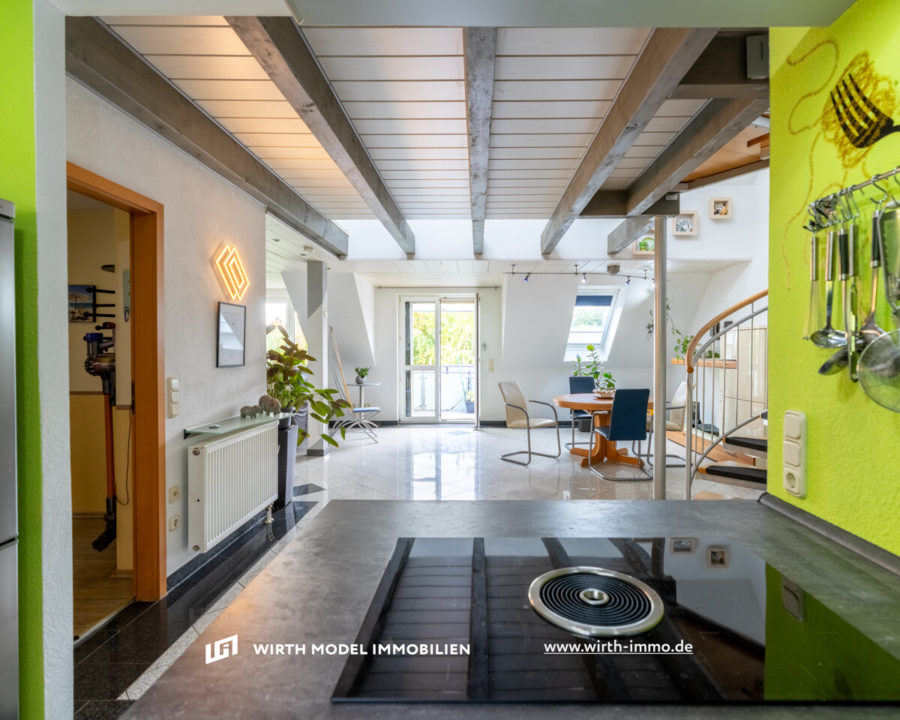 Zum Verkauf steht diese sehr ansprechende und großzügige Maisonette-Wohnung in gefragter Lage in unmittelbarer Nähe zur Schweinfurter Innenstadt. Betreten wir die Immobilie durch einen Flurbereich, welcher gelungen in den offen gestalteten Wohn-/Ess- und Küchenbereich überleitet. Weiterhin ermöglicht dieser besagte Flurbereich den Zugang in das Tageslicht-Gäste-WC mit Handwaschbecken. Der Wohnbereich umfasst eine Fläche von rd. 35 m² und ist durch zahlreiche Fenster sowie eine bodengleiche Fensterfläche zum Balkon (tlw. mit Glasüberdachung, Balkonkraftwerk vorhanden und elektrische Markise) erstklassig belichtet. Der Küchenbereich ist offen gestaltet und die verbaute Einbauküche samt der zugehörigen Elektrogeräte (u. a. BORA Kochfeld mit Abzug) ist im Kaufpreis enthalten und wird entsprechend mit veräußert. Eine praktische Speisekammer steht zur Verfügung.